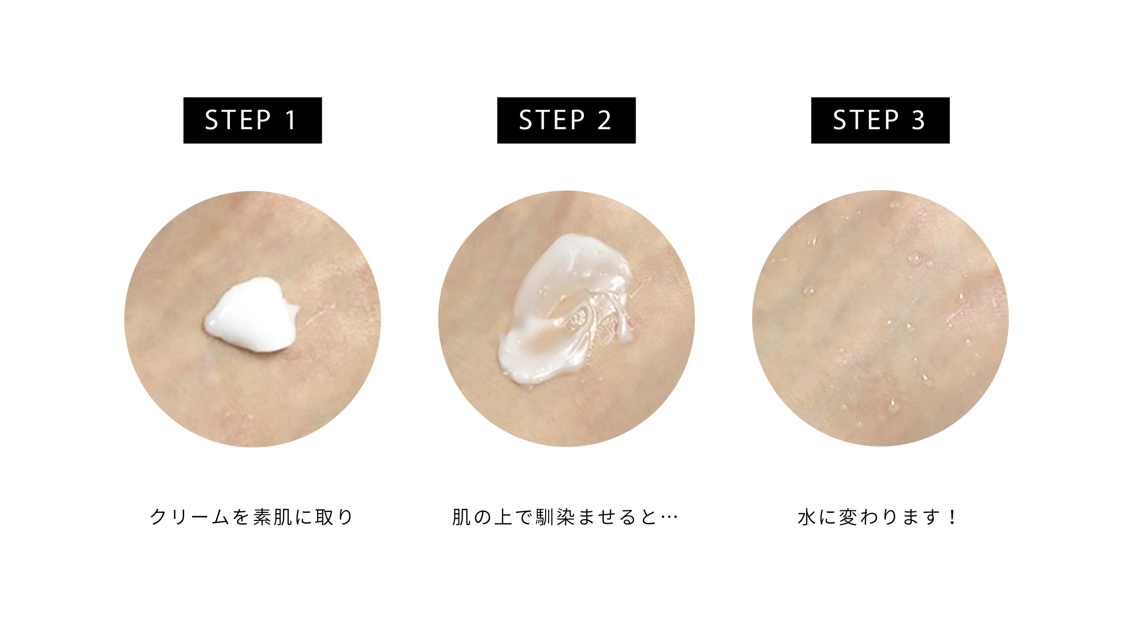 素肌の上で水に変わるウォータークリーム。